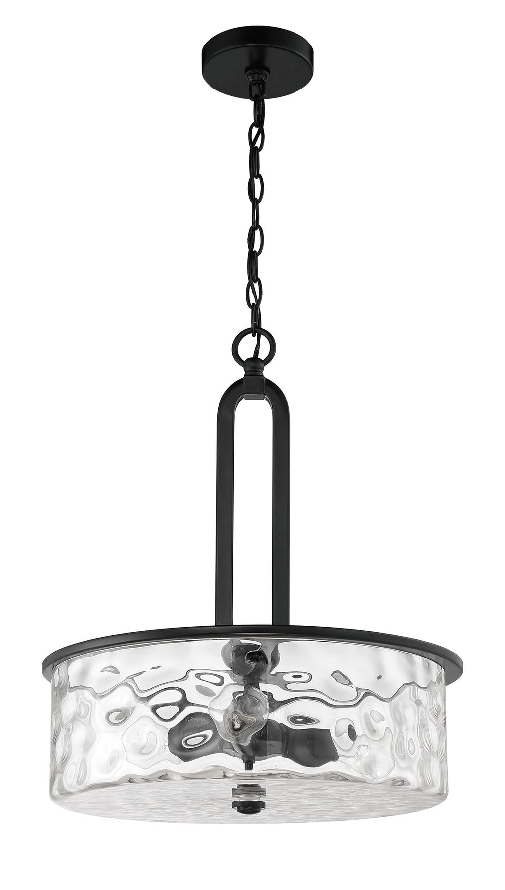 The Collins 3 Light Pendant in Flat Black is a stunning addition to any indoor space, providing both style and functionality. This mini pendant features a unique design with graceful geometric elements and clear hammered glass shades that diffuse light beautifully. It requires one medium base 60 watt bulb (not included) and is equipped with 3 x 12-inch downrods and a 6-inch downrod for customizable height. With dimensions of 5.13 inches in width and depth, and a height of 14 inches, it's perfect for various settings. Additionally, it comes with a 1-year limited warranty and is UL listed for safety.