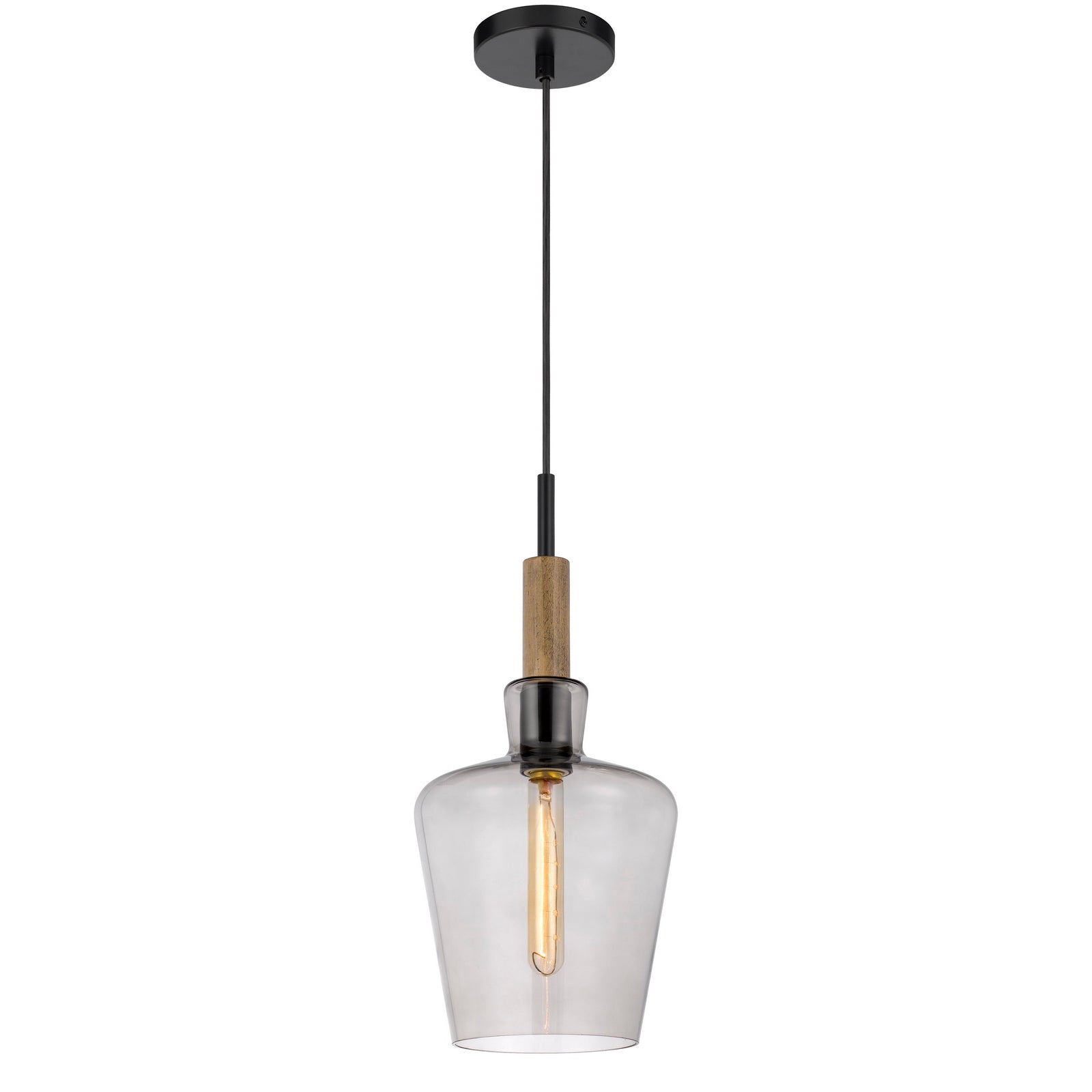 The Swindon Glass Drop Pendant (Product No. FX-3779-1) beautifully combines durable metal, wood, and glass elements for a stylish lighting solution. Featuring a round smoked glass shade and wooden accents, it is perfect for enhancing any kitchen, island area, or foyer. This pendant includes six feet of cord and a canopy for easy installation, although an Edison bulb is not included. It operates hardwired and ships in one carton. With a wattage of 60W and a black base color, this pendant adds a modern touch while ensuring functionality.