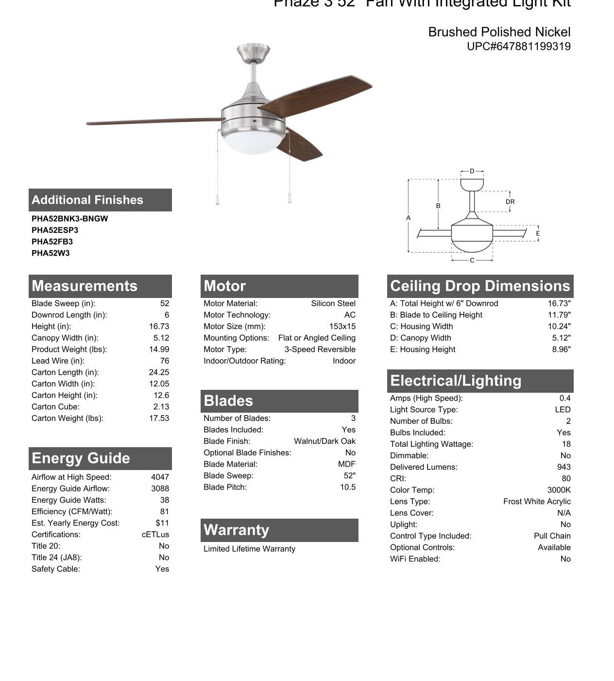 Modern and minimalist, the Phaze 3 52" features a sleek tri-blade design powered by a 3-speed, reversible motor, integrated lighting with non-dimmable LED bulbs included.
