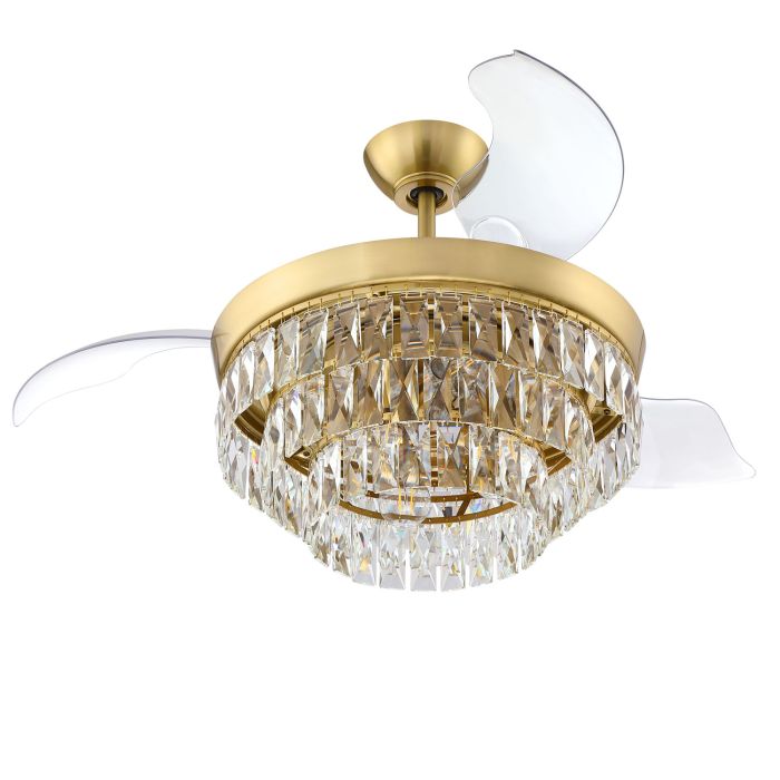 The Sofia 42" hidden blade ceiling fan features three elegant layers of faceted clear acrylic drops that surround an integrated two-tiered 6-light kit with dimmable LED bulbs included and hidden, retractable clear polycarbonate custom blades. The Sofia 42" ceiling fan combines the best features of brilliant luxury lighting with the benefits of a ceiling fan that is easily controlled with either the included remote control or the integrated WIFI for use with most smart home devices, smart phones and systems.