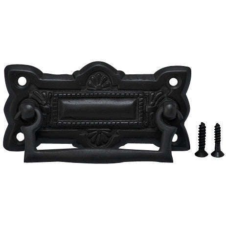 Measures 3 3/4 inches wide and 2 inches tall. Front mounting with four wood screws (included). Comes complete with mounting hardware. This product comes as an unlacquered natural brass and it will patina over time. A high strength lacquer coating is available upon request. Available in several finishes - and a coordinating knob is also available. This item usually ships in 1 to 2 business days.