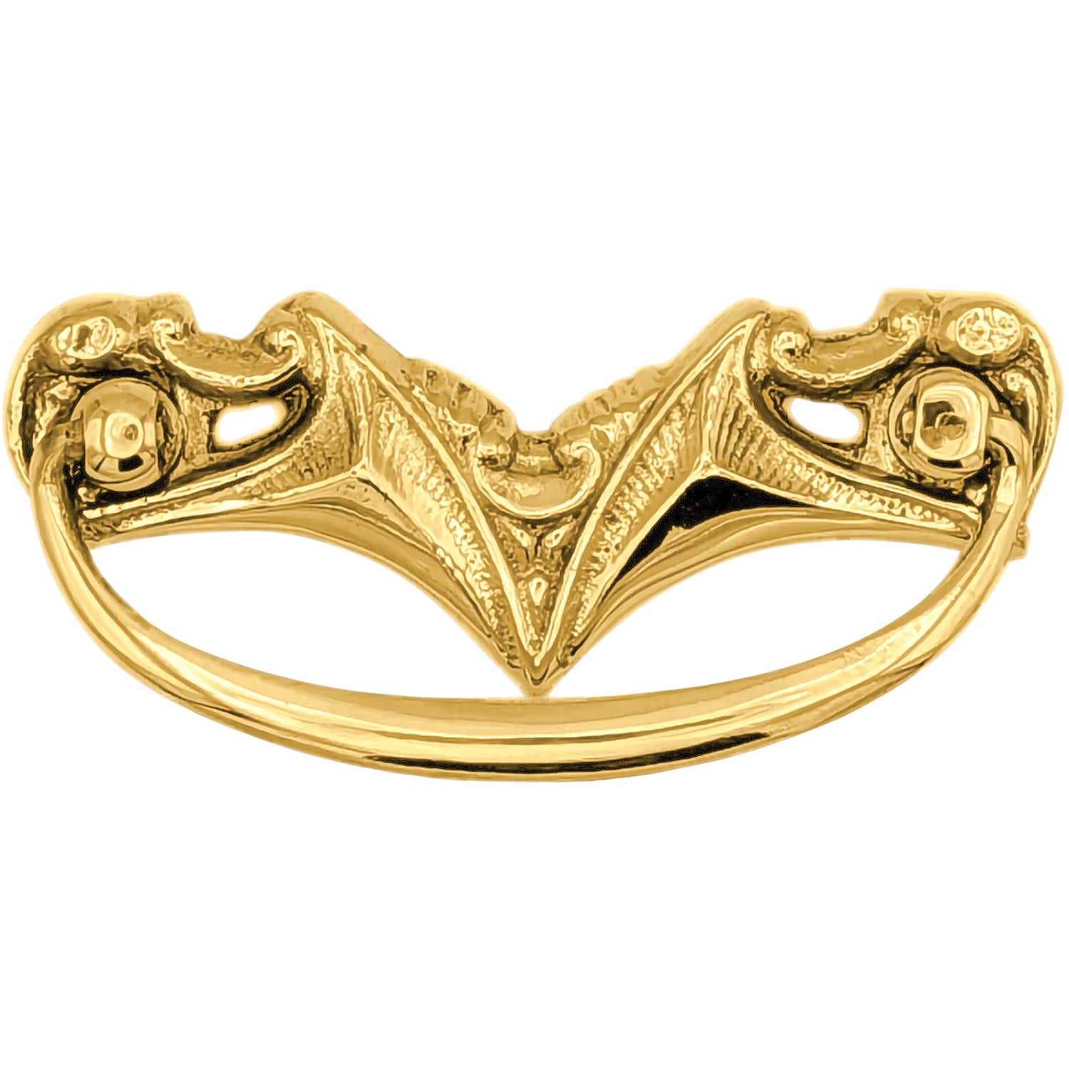This uniquely crafted piece measures 3 5/8 inches overall with a mounting center-to-center distance of 3 inches. Pull projects 1 1/2 inches. Available in polished brass, antique brass and Black Bronze. Comes complete with mounting hardware.