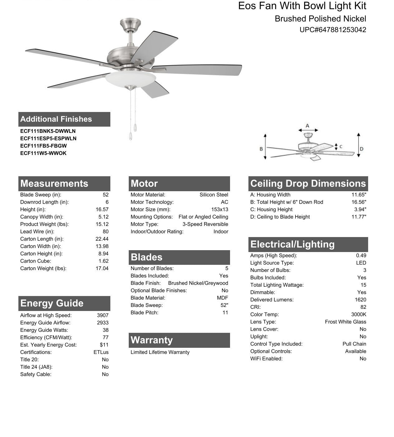 The Craftmade Eos 52" ceiling fan with white frost glass low profile bowl three light kit including dimmable LED bulbs features a smooth, 3-speed, reversible motor, updated blade arms, and reversible custom 52" blades. Optional remote controls are available (Sold Separately).