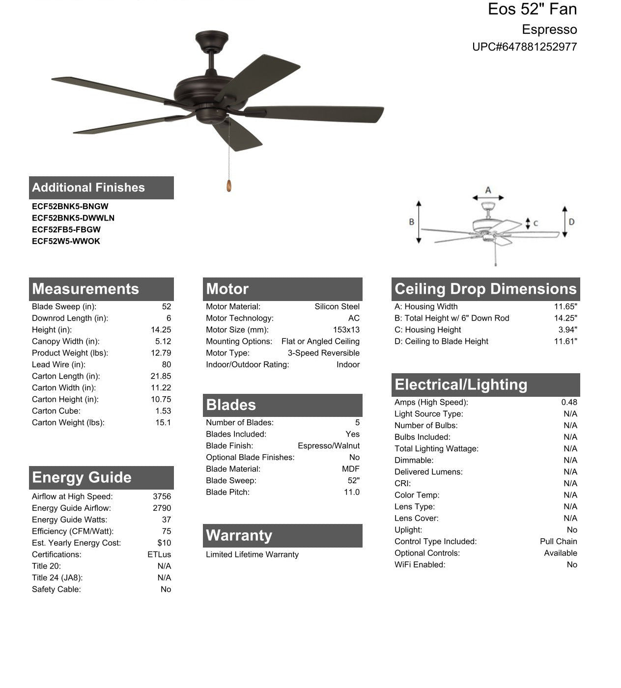 The Craftmade Eos 52" ceiling fan features a smooth, 3-speed, reversible motor, updated blade arms, and reversible custom 52" blades. Optional remote controls are available (Sold Separately).