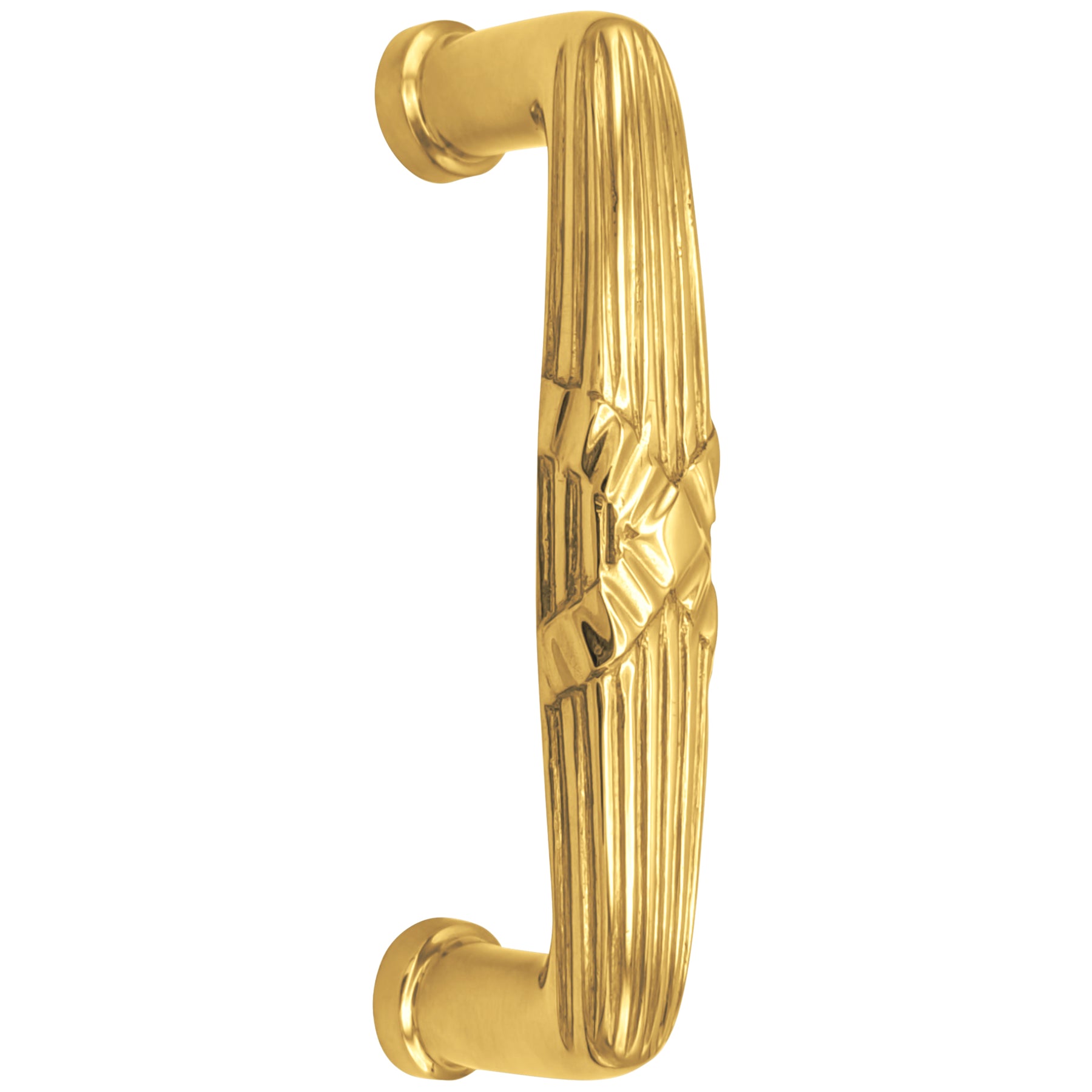 This Art Deco pull and push plate set features a sleek elongated form with rounded ends, highlighted by elegant vertical ridges that add texture and depth. Crafted in solid brass, it captures the glamour of early 20th-century design. Perfect for adding a touch of sophistication, it blends timeless functionality with decorative appeal.