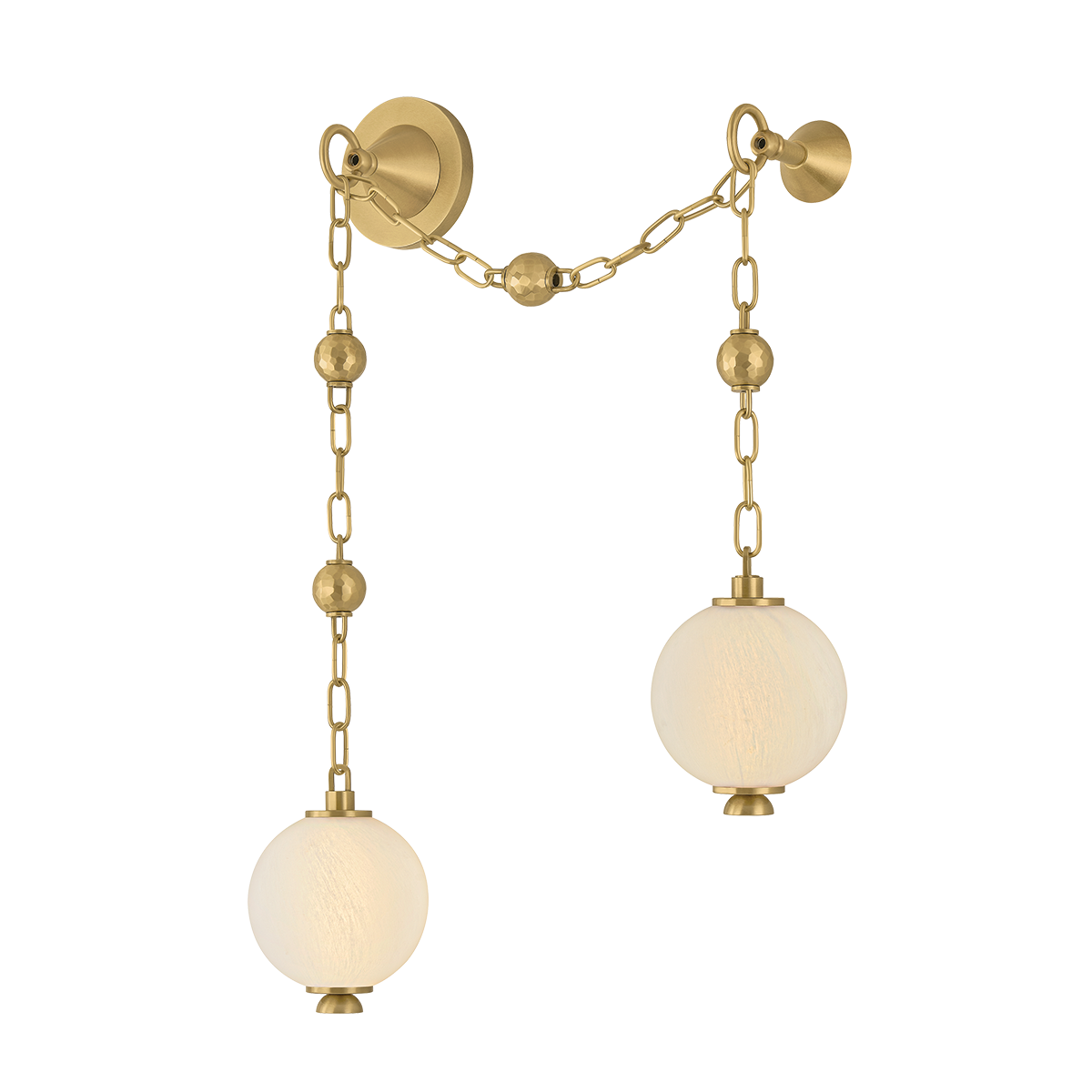 Corda draws inspiration from the elegance of heirloom jewelry—where light becomes adornment, and structure tells a story. Hand-blown matte cloud glass spheres are suspended from gleaming Vintage Brass chains, accented by delicate ball chain details, evoking the richness of layered pearl and charm necklaces. Available as a 2-light sconce, a 6-light linear, and a dramatic 12-light chandelier, Corda’s layered suspension system allows for customizable hanging methods, introducing an unexpected sense of movement and personalization. It brings a sense of intimacy and ornament to a space, casting a warm, glamorous glow that is both delicate and intentional.