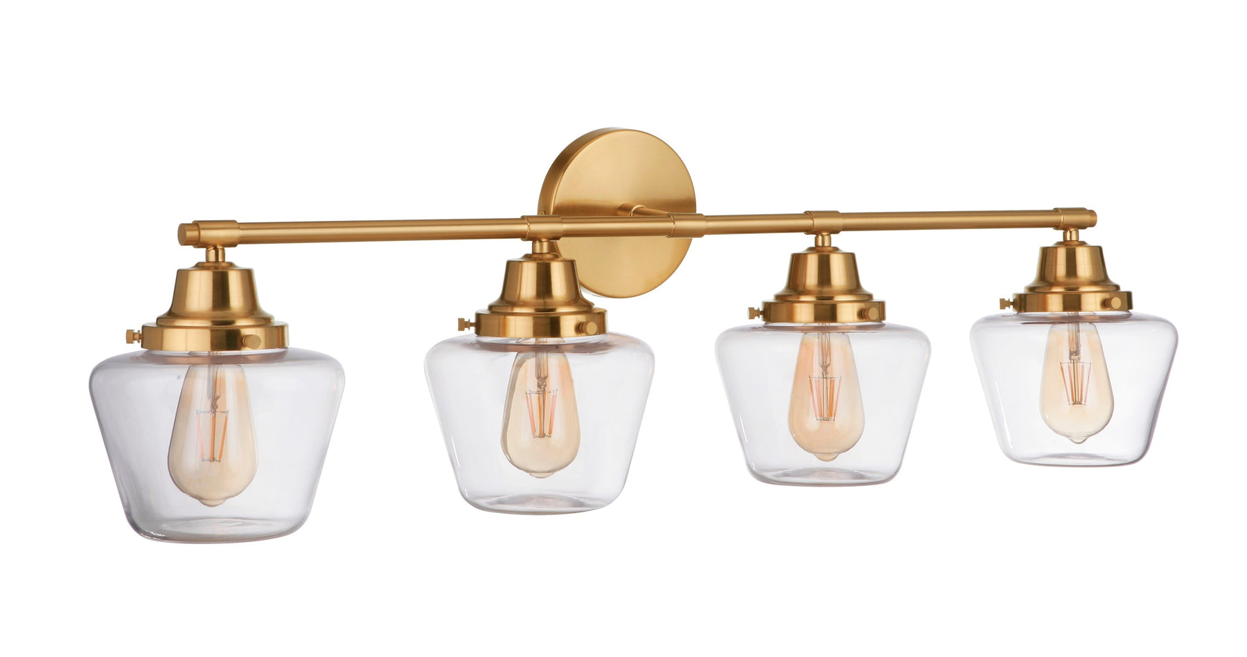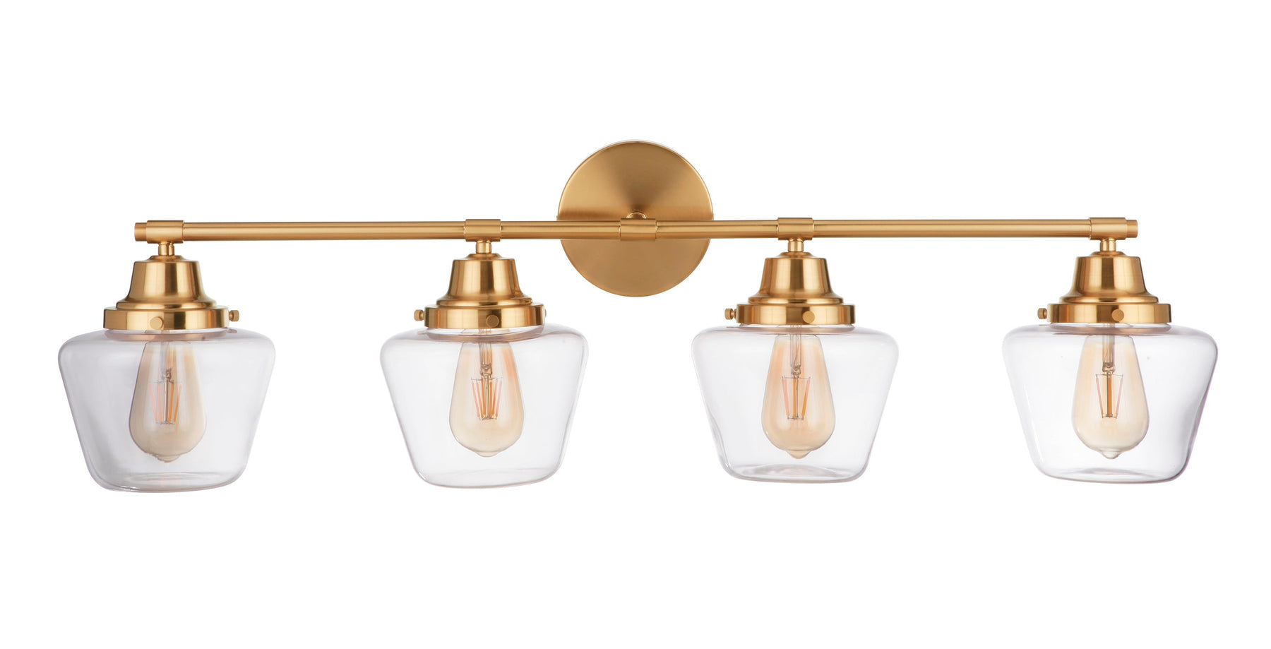 The Essex 4 Light Vanity in Satin Brass is a timeless classic suitable for a variety of settings. It features stunning clear glass schoolhouse globes and requires four medium base 60-watt bulbs (not included). With dimensions of 38 inches in width, 38 inches in depth, and 11 inches in height, this wall-mounted fixture has an extension of 9 inches. The Essex collection is damp rated, making it perfect for bathrooms and other humid locations. Completed with a 1-year limited warranty, this fixture not only enhances your space but also ensures safety with its cULus safety rating.