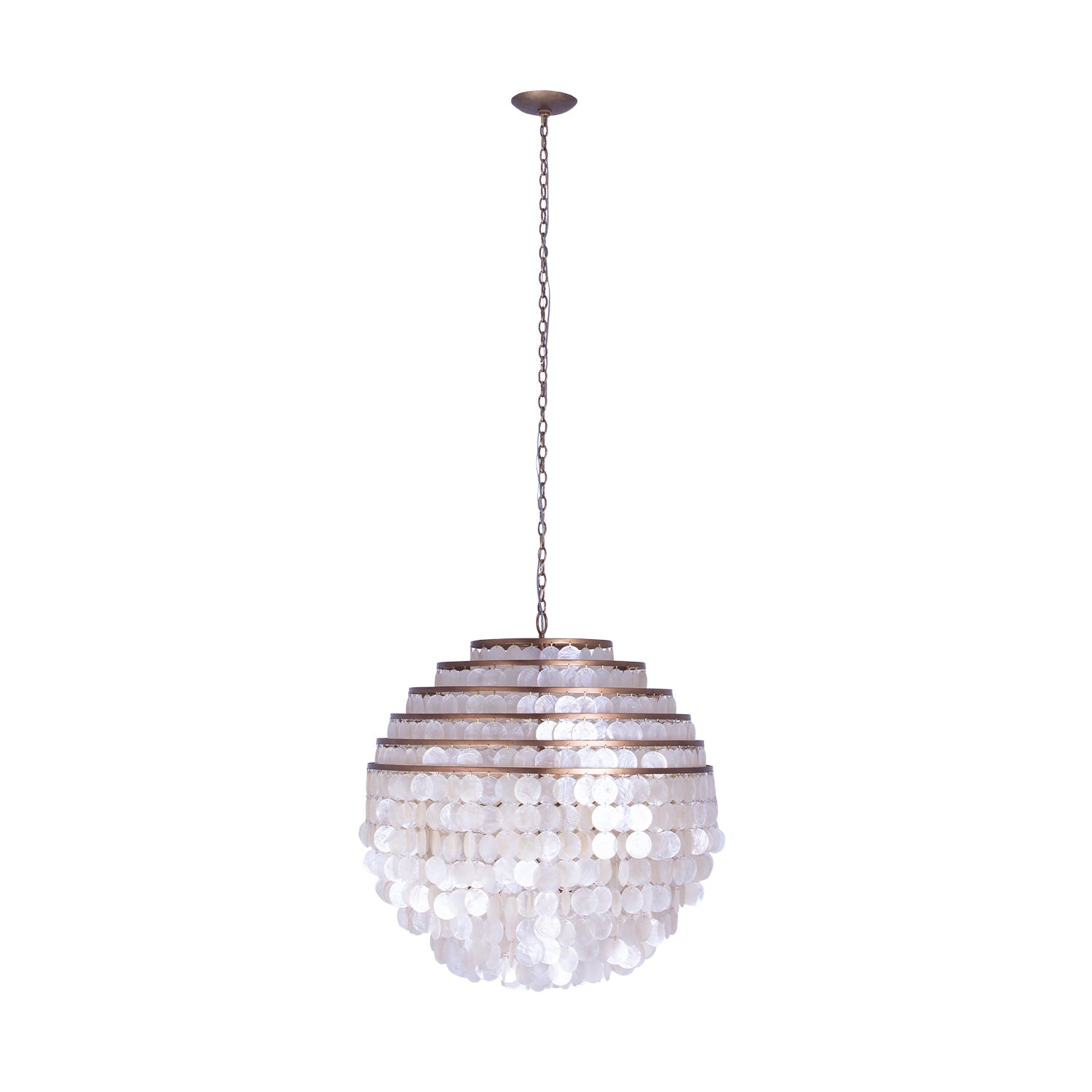 A modern makeover of the cascade capiz chandelier, Sphere showcases natural, free hanging capiz shells to create a natural shimmer effect. The Pearlized Antique Brass finish compliments the iridescent natural shells providing volume all while giving your space a light and airy vibe.