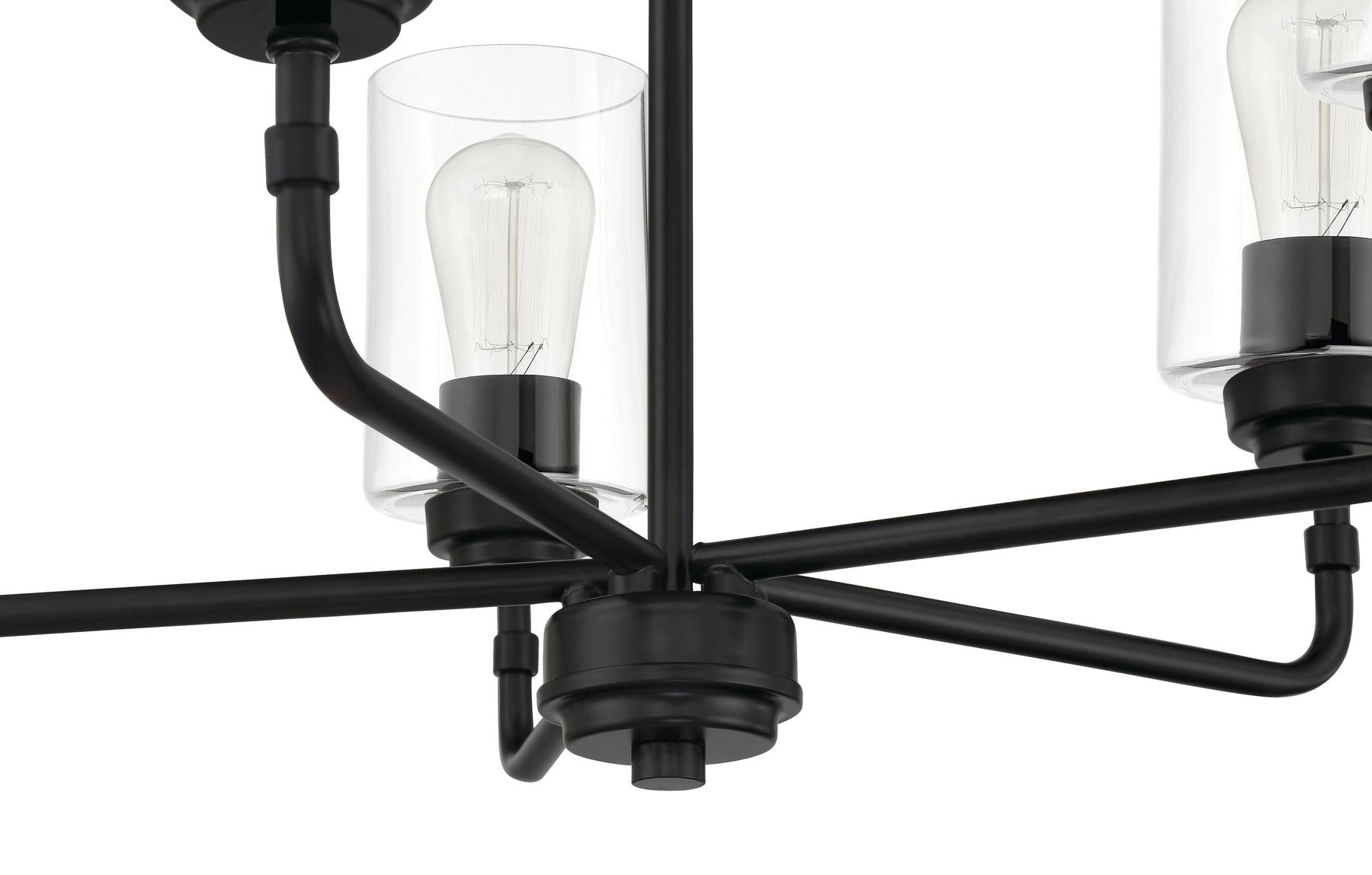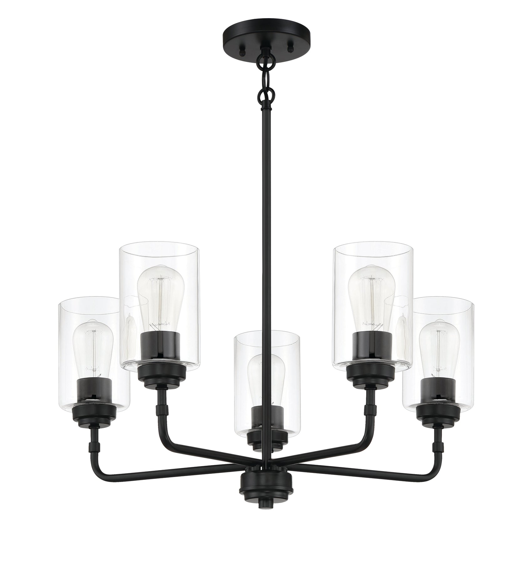 The Stowe 5 Light Chandelier in Flat Black is a perfect blend of style and functionality, designed to create a warm and inviting atmosphere for your gatherings. Featuring a sophisticated design, it requires five medium base E26 bulbs (not included) with a maximum wattage of 60W each. With dimensions of 23 inches in depth, 23 inches in width, and a height of 13.50 inches, this indoor-rated chandelier is supported by 3 downrods (two at 12 inches and one at 6 inches) allowing for customized installation. The chandelier also includes a clear glass shade and a 1-year limited warranty, ensuring lasting quality and elegance for any indoor space.