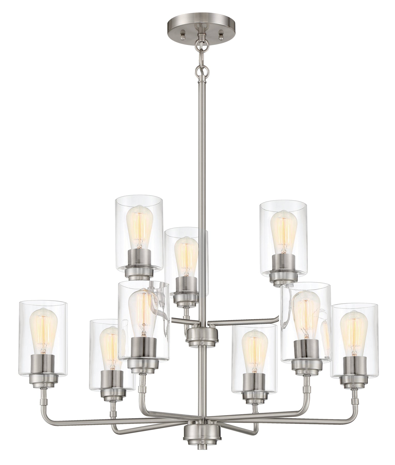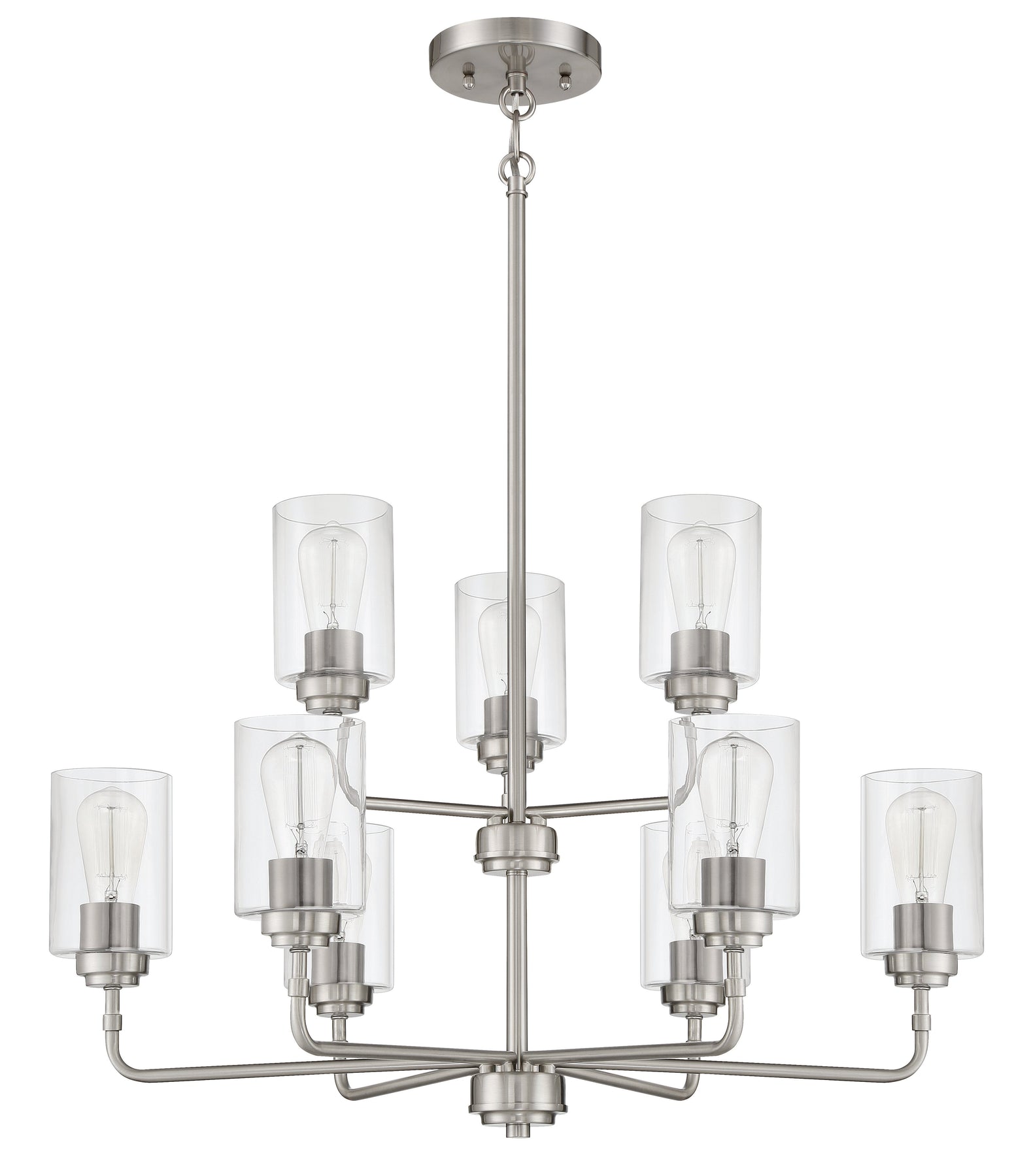 The Stowe 9 Light Chandelier in Brushed Polished Nickel is a refined lighting fixture that enhances any indoor space with its elegant design. This chandelier requires nine medium base A19 bulbs at a maximum wattage of 60W each (bulbs not included). It features a substantial depth and width of 30 inches, with a height of 19.75 inches, and is equipped with 3 x 12 inch and 1 x 6 inch downrods for adjustable mounting. The fixture also includes a leadwire length of 120 inches and a canopy measuring 5 x 5 x 0.79 inches. With its clear glass accents and a safety rating of cULus, the Stowe chandelier combines both style and safety for a warm, inviting atmosphere.