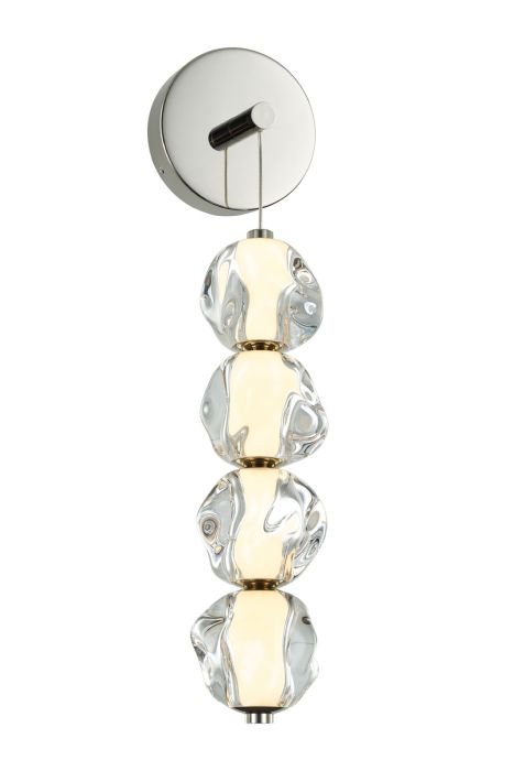 The Jackie Wall Sconce in Polished Nickel is inspired by contemporary elegance, reminiscent of a luxurious pearl necklace. This striking fixture features a 16 Watt integrated LED that provides a warm 3000K glow at an impressive 821 lumens, and is fully dimmable for customizable ambiance. Measuring 6.30 inches in width, 25.63 inches in height, and extending 6.30 inches from the wall, it is perfect for indoor settings. With a high Color Rendering Index (CRI) of 90, it showcases colors beautifully, while its durable construction includes a 1-year warranty on the fixture and a 3-year warranty on the LED. The wall mount design ensures a sleek, modern look in any space.