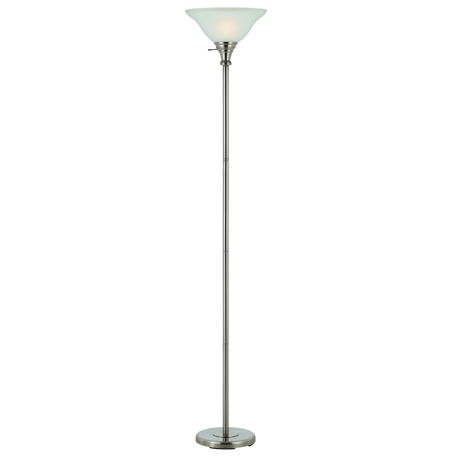 The 150W 3-Way Torchiere (Product No. BO-213-BS) with a glass shade offers a perfect blend of durability and elegance. Constructed from sturdy metal in a brushed steel finish, this floor lamp features a convenient on/off switch located on the neck base and a versatile 3-way mechanism, allowing for optimal control of lighting intensity. The lamp includes a stylish frosted glass shade and a generous 6-foot cord for easy placement. Standing at an impressive 70 inches tall, it arrives securely packaged in one carton and comes with a one-year warranty, ensuring peace of mind.