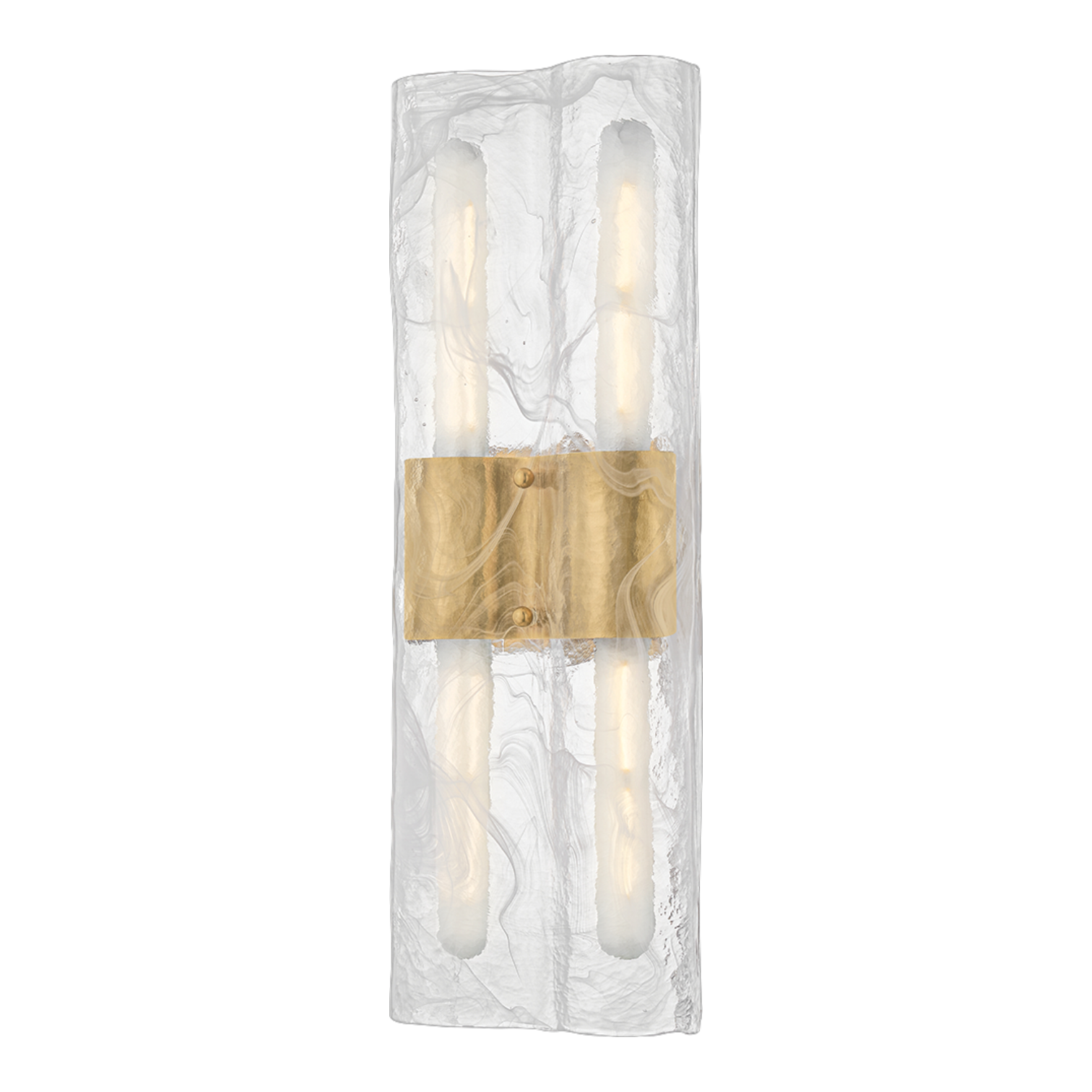 Organic shaping, specialty glass, and a subtle peek of metal combine to form the enigmatic Bromo sconce. Made from clear Blonchino glass, the tubular shade swirls with wispy white tendrils that evoke the natural movement of smoke. From within the shade, glimpses of the Vintage Brass finish on the hardware shine through like a hidden treasure, adding an artful glint to this wall light.